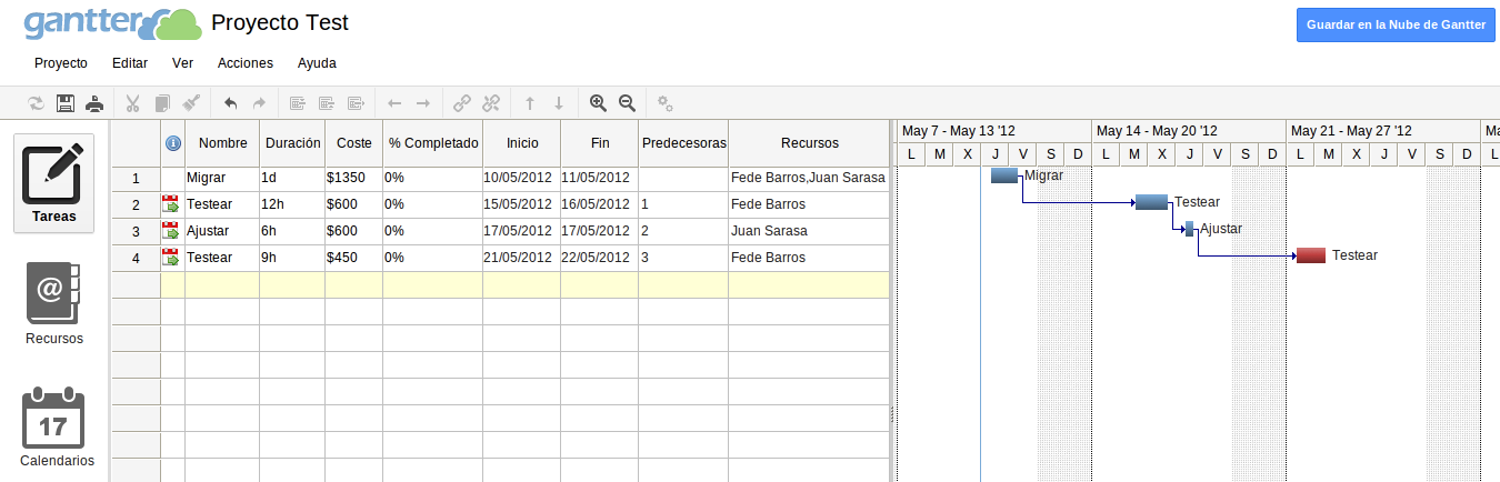 Cuando arrancamos un nuevo proyecto, uno de los primeros pasos que tenemos que dar es el de la planificación de éste, es decir, la división del proyecto en una serie de hitos y paquetes de trabajo que emplazaremos dentro de un calendario. Por regla general, tanto nuestro jefe como nuestro cliente nos pedirán algún tipo de representación gráfica de la planificación que les permita ver, de una manera clara, las tareas y actuaciones que componen el proyecto y, entre las posibles representaciones, una de las más extendidas son los diagramas de Gantt. Herramientas como OpenProj o Microsoft Project nos permiten realizar este tipo de planificaciones pero, en ambos casos, la interoperabilidad es muy limitada y, además, requieren la instalación de un cliente de escritorio. Si lo que buscamos es flexibilidad, bajo coste, la posibilidad de poder trabajar en la nube y procesar archivos procedentes de Microsoft Project, quizás Gantter sea lo que estamos buscando. Gantter es un servicio web que nos permite gestionar proyectos usando diagramas de Gantt. Estos diagramas son muy útiles para gestionar diferentes proyectos que requieren planificación y recursos en el tiempo. Uno de los aspectos más interesantes de Gantter es que está en la nube, es decir no necesitas instalar nada y tan sólo es necesaria una conexión a internet y un navegador web. Otro punto a tener en cuenta es que es gratuito y está en diferentes idiomas incluido el castellano.